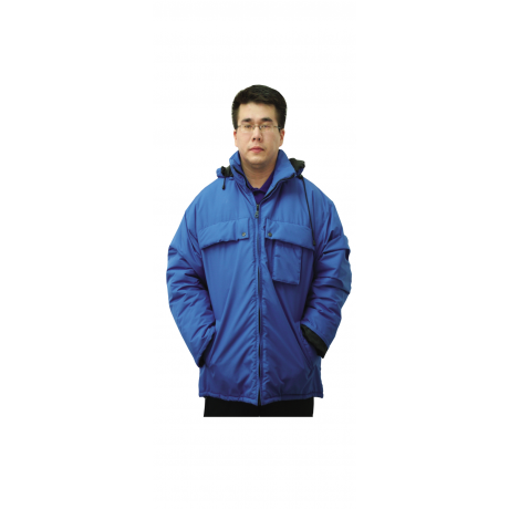 Центральная застежка на замке "молния"доходяящая до конца воротника. На полочке расположены два кармана под планкой на кнопке.С право прорезной внутренний на молнии. С лево накладной карман вида "портфель". Два нижних прорезных кармана "в листочку" на замке "молния" расположенные наклонно. На подкладе левой полочки один накладной карман из основной ткани. Спинка прямая Рукав прямой втачной. Низ рукава прямой. Воротник -стойка, внутренний из основной ткани. Капюшон съемный на замке "молния", по лицевой части стягивается шнуром с фиксатором на концах. Внутреняя часть капюшона утепленная флисом.