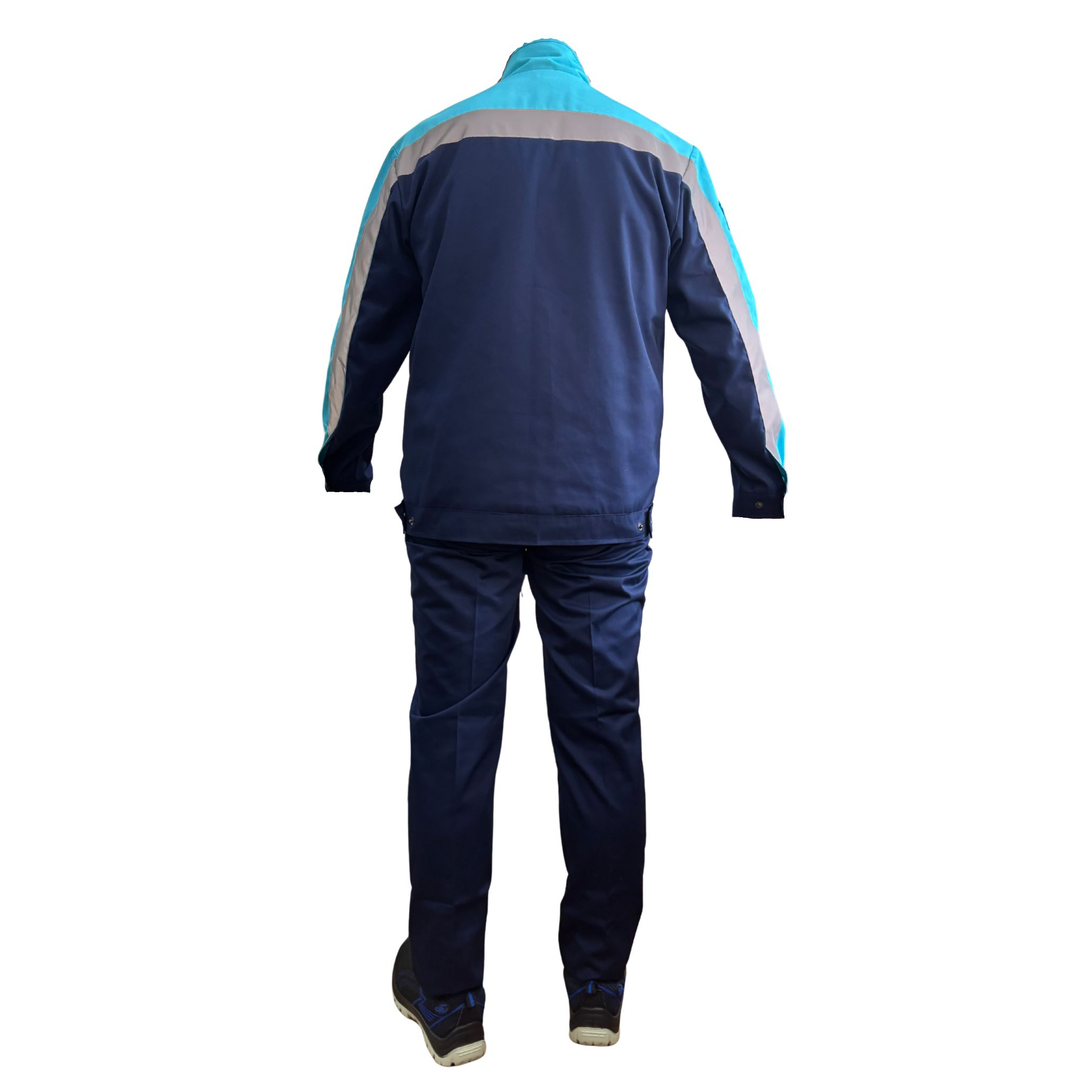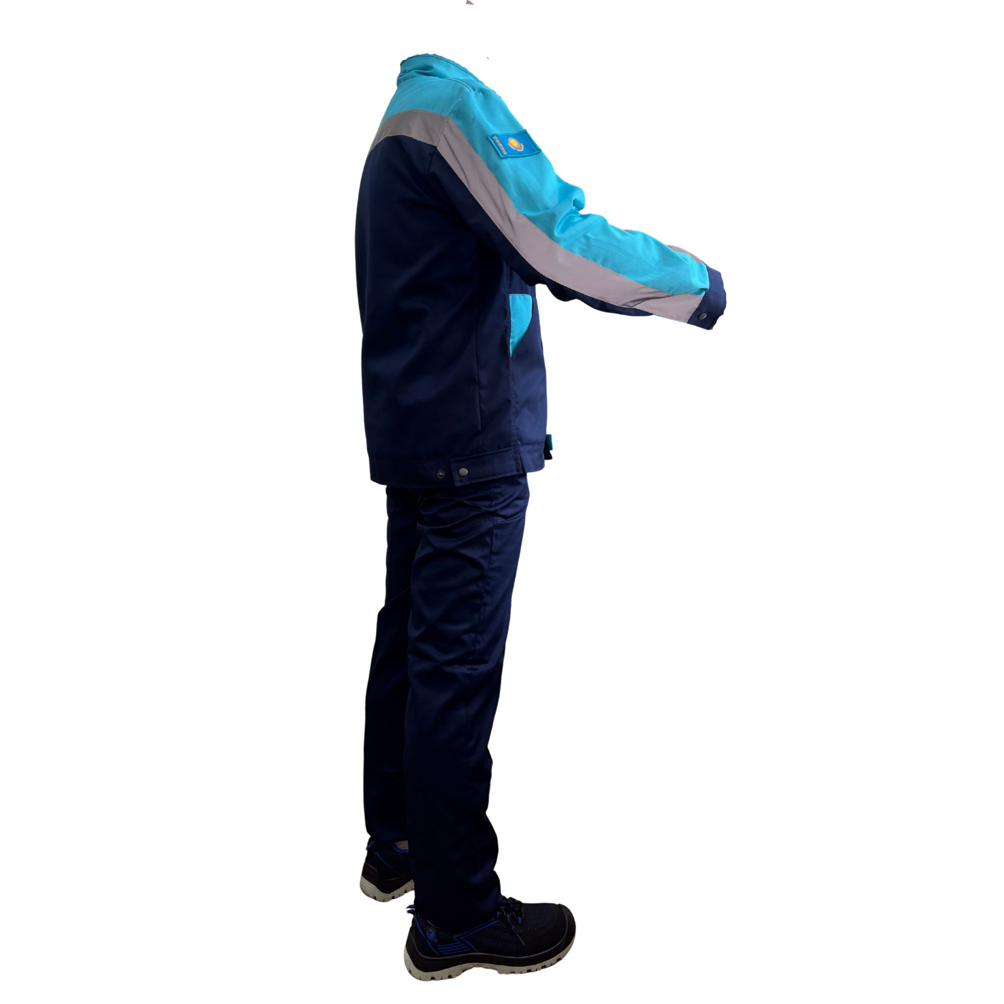 Комплект летний куртка+ брюки.  Куртка. Спинка и полочка с кокетками. Центральная застёжка на молнии закрытая планкой на кнопках. Воротник стойка . Два верхних, накладных кармана фигурных с клапаном на липе. Внутренние края кармана (которые ближе к планке) без ребер, нижний край и внешний с ребром на объем. Два нижни в листочку  с боковым входом. Под левым карманом, находится внутренний разрезной на молнии, дополнительный вертикальный карман разрезной на правой полочке. Декоративные накладки на плечах выполнены из контрастной ткани.  Рукав втачной, двухшовный. Низ рукавов на манжете на кнопках. Манжета из контрастной ткани по внешней части рукава от манжеты до локтя контрастная накладка  Низ куртки на поясе, по бокам паты на кнопках. По бокам вставки (накладки) из контрастной ткани. Спинка прямая без кокетки.  Брюки . на при тачном поясе частично на эластичной ленте. Гульфик на «молнии», застежка на пуговицу. Шлевки под ремень, шлевка под молоток справа По бокам два внутренних  кармана  с круглым  входом. Два нижних, накладных кармана полупотфеля с клапаном на липе выполнены из контрастной ткани. Один задний накладной карман с правой стороны.